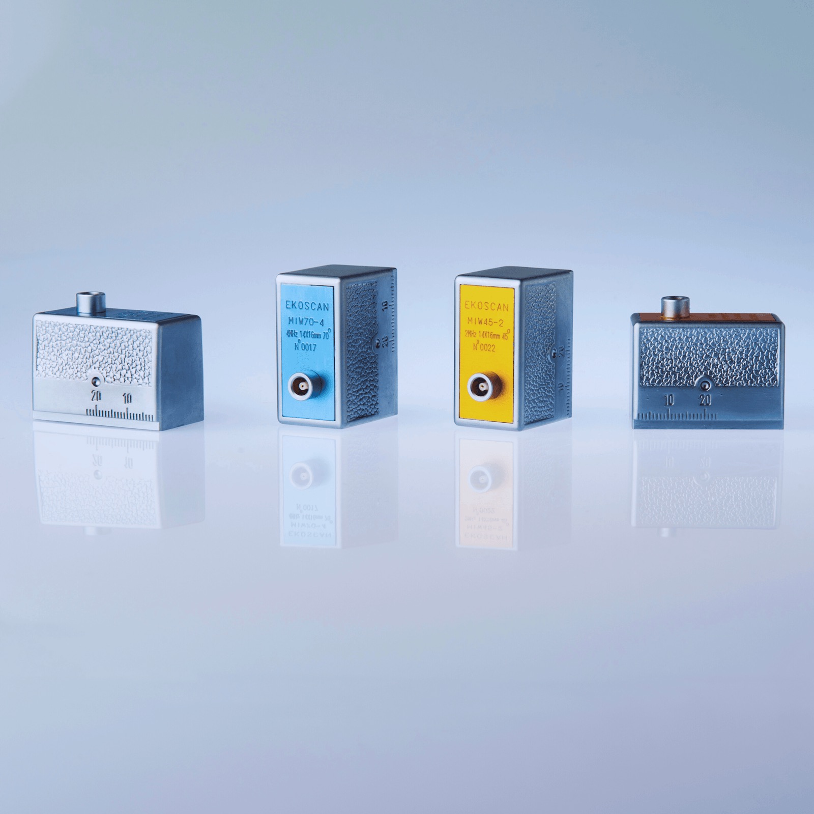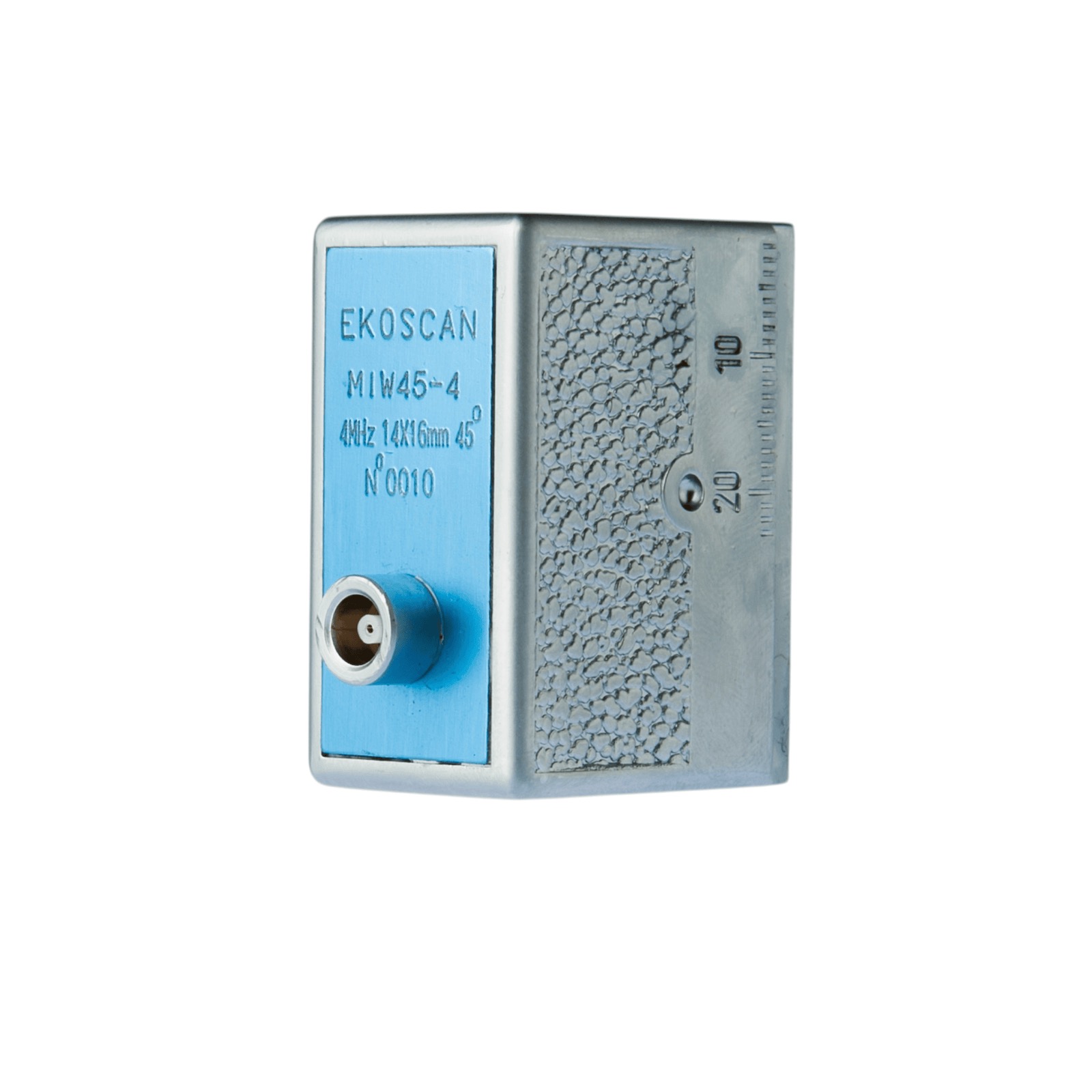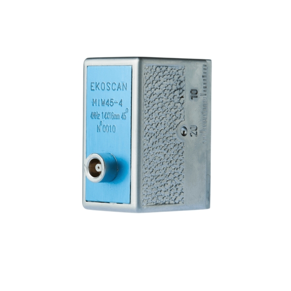 Nomenclature : MIWXX-YY ZZxAA PC BB, où XX est l’angle de réfraction nominal de l’onde transversale dans l’acier, YY est la fréquence en MHz, ZZ est la largeur du cristal piézoélectrique, AA est la longueur du cristal, et BB est vide ou TC pour connecteur supérieur.