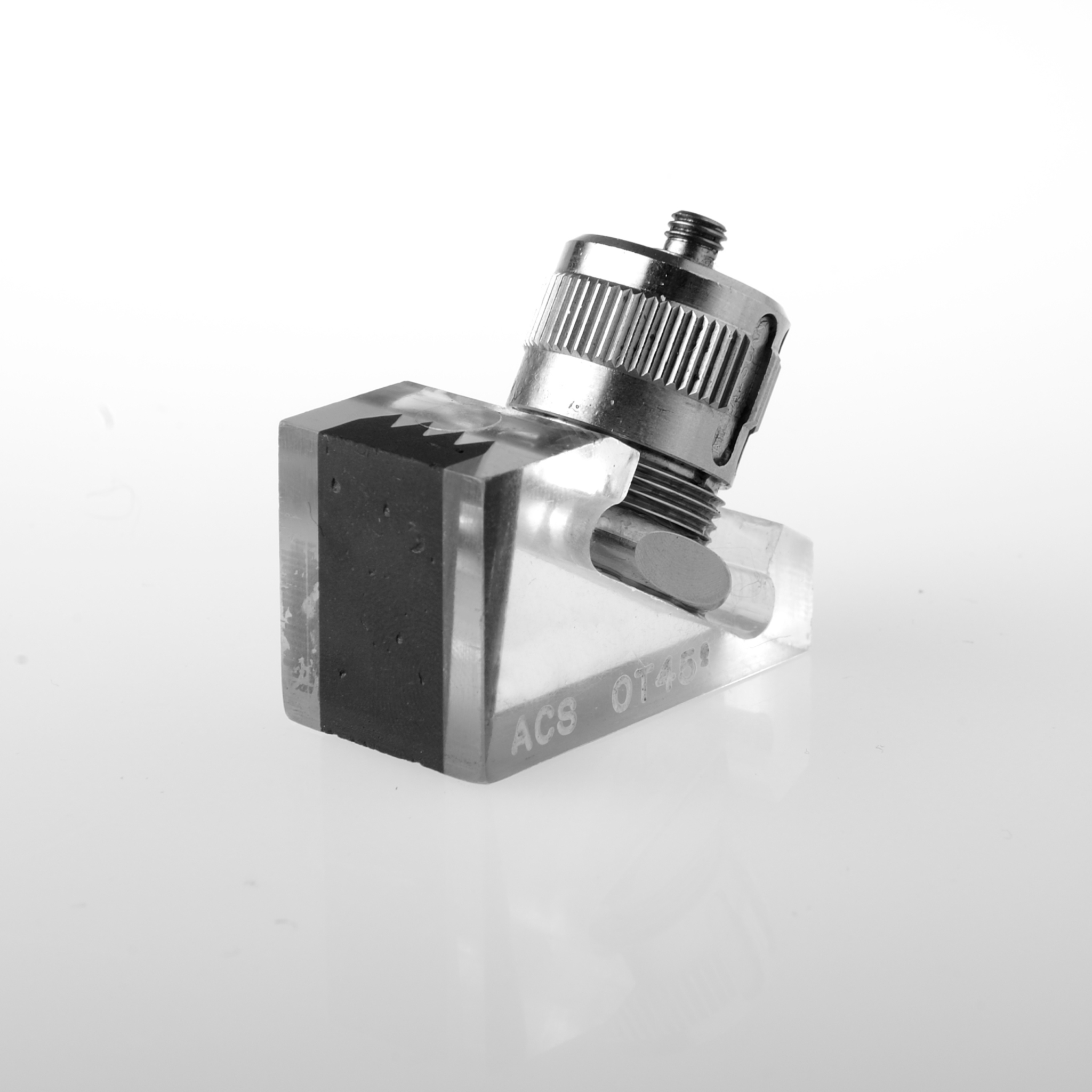 Interchangeable wedge for SWQ-6 probes.They are available for 35, 38, 45 60 and 70° longitudinal waves. Attachment between probe and wedge by thread.